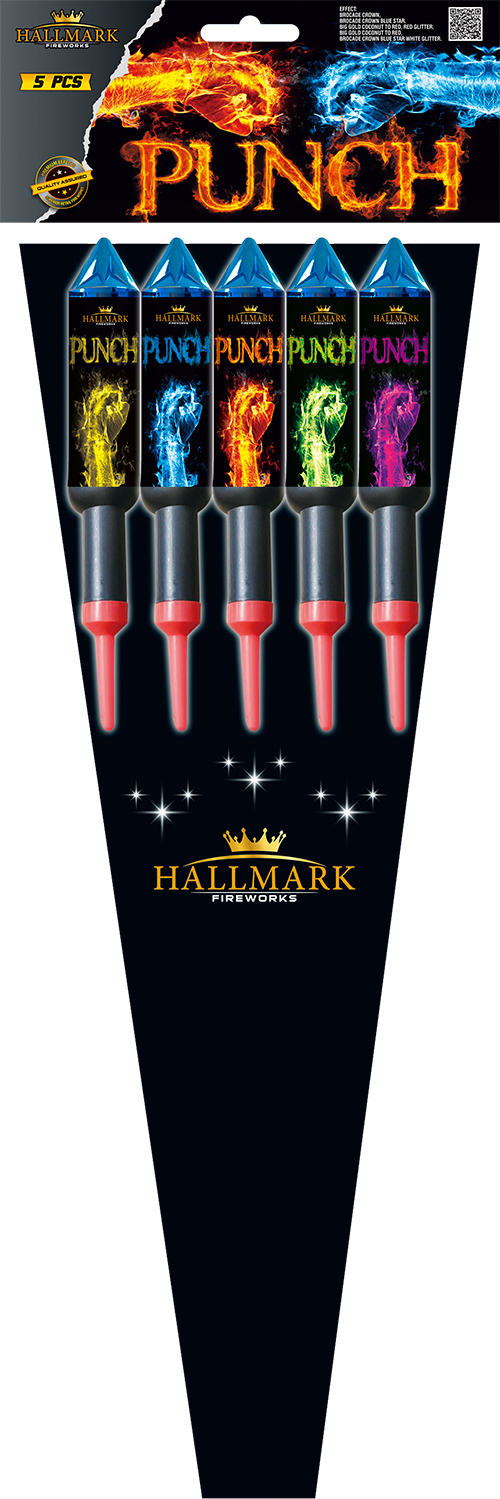 Get ready for impact. Punch Rockets deliver five powerful skybound bursts designed to dominate the night sky. With a total of 325g NEC, each of the five rockets launches with serious lift and ends in a high-impact explosion of colour, crackle, and flash.